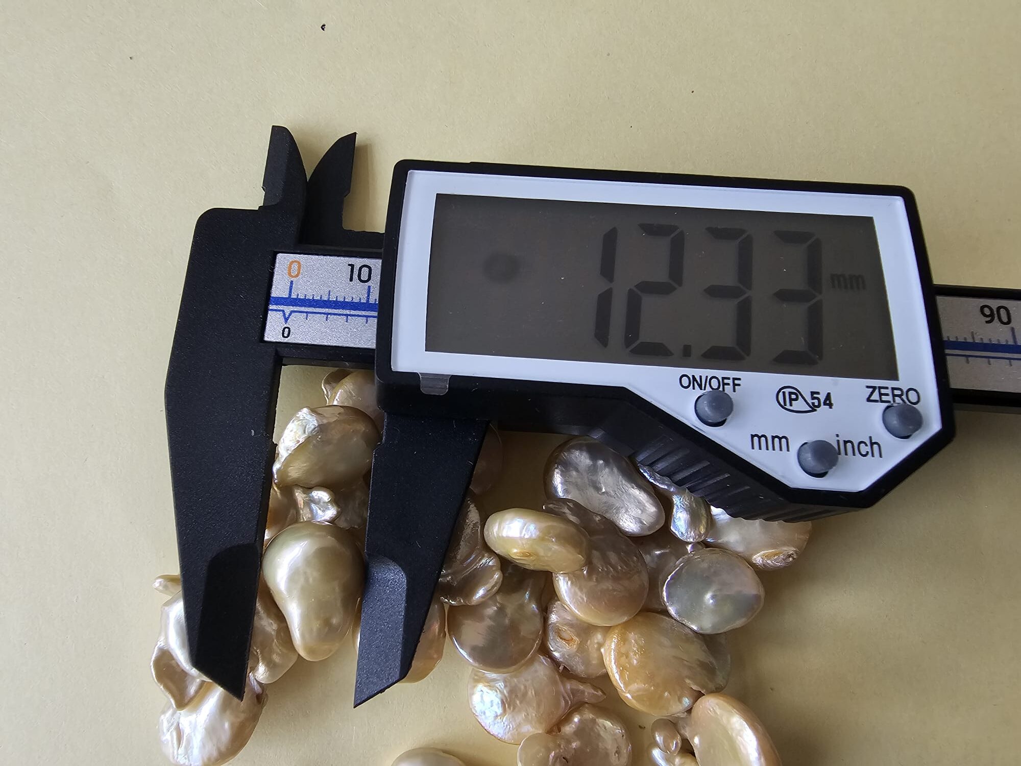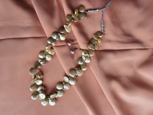 Pearl Type: Authentic Freshwater pearls Quality: AA Shape: Keishi Size: Approx. 12.5 mm Stud size: 9 mm Approx. Finish: Soft natural Golden Yellowish Length: 16 inches. Clasp: Silver metallic cord Design: Statement piece